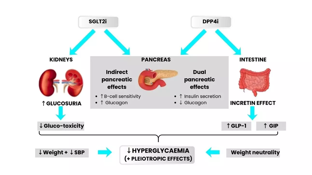 The updated February 2026 NICE NG28 guideline highlighted that SGLT2 inhibitors are now recommended as first-line therapy for newly diagnosed T2DM, and when eGFR declines below 45 mL/min/1.73 m², the guideline advises continuing the SGLT2 inhibitor for cardiorenal protection while adding a DPP-4 inhibitor to maintain glycemic control.[7] The ADA Standards of Care 2026 recommends considering combination therapy as initial treatment to shorten time to glycemic goal attainment, and advises consideration of SGLT2 inhibitors for patients with established or high-risk atherosclerotic cardiovascular disease, heart failure (with reduced or preserved ejection fraction), and for comprehensive cardiorenal risk reduction, irrespective of HbA1c. DPP-4 inhibitors are recognized as weight-neutral add-on agents. [8]