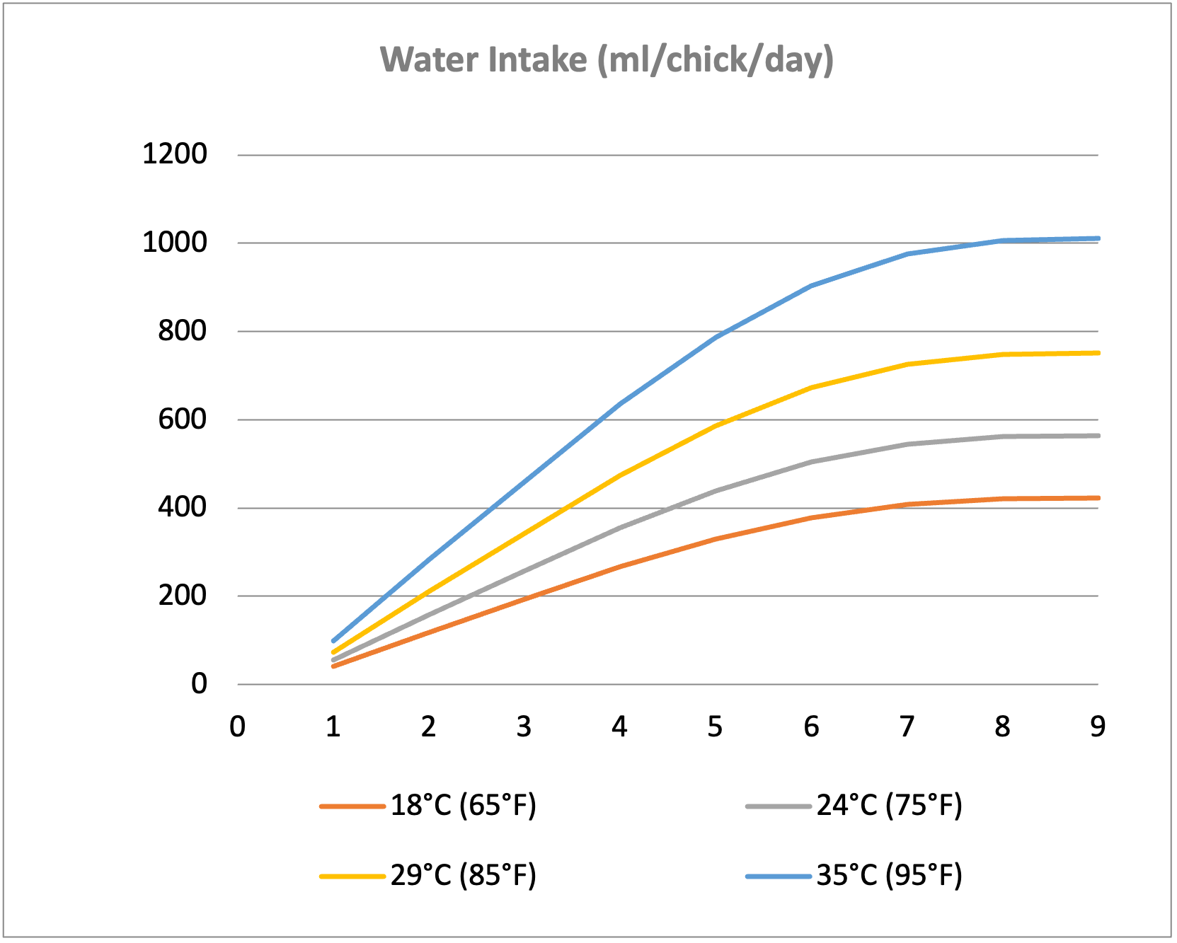 Environmental temperature can impact heavily on water intake (Figure 2). The water intake of chickens is approximately double that of feed intake (1.8:1, at a temperature of 21 °C (70 °F) in bell drinkers). However, in heat-stressed birds this level will be increased. A chicken’s water intake will increase by 6–7% for each degree above 21°C (70°F, NRC, 1994).