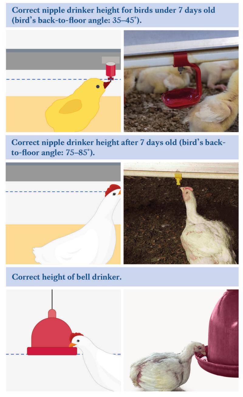 In most modern broiler units, nipple drinkers are the system of choice; these have the advantage of reducing disease spread, providing cleaner water, and reducing the labor requirements for clean out. However, good management is necessary for the proper operation of nipple drinker systems. Management factors that influence water intake in such systems are water line height (birds should lift their heads to reach the nipple drinker which should be higher than the birds’ back to prevent bumping and leakage, see Figure 3), water line maintenance (regular flushing and cleaning), drinker line location, and water pressure.