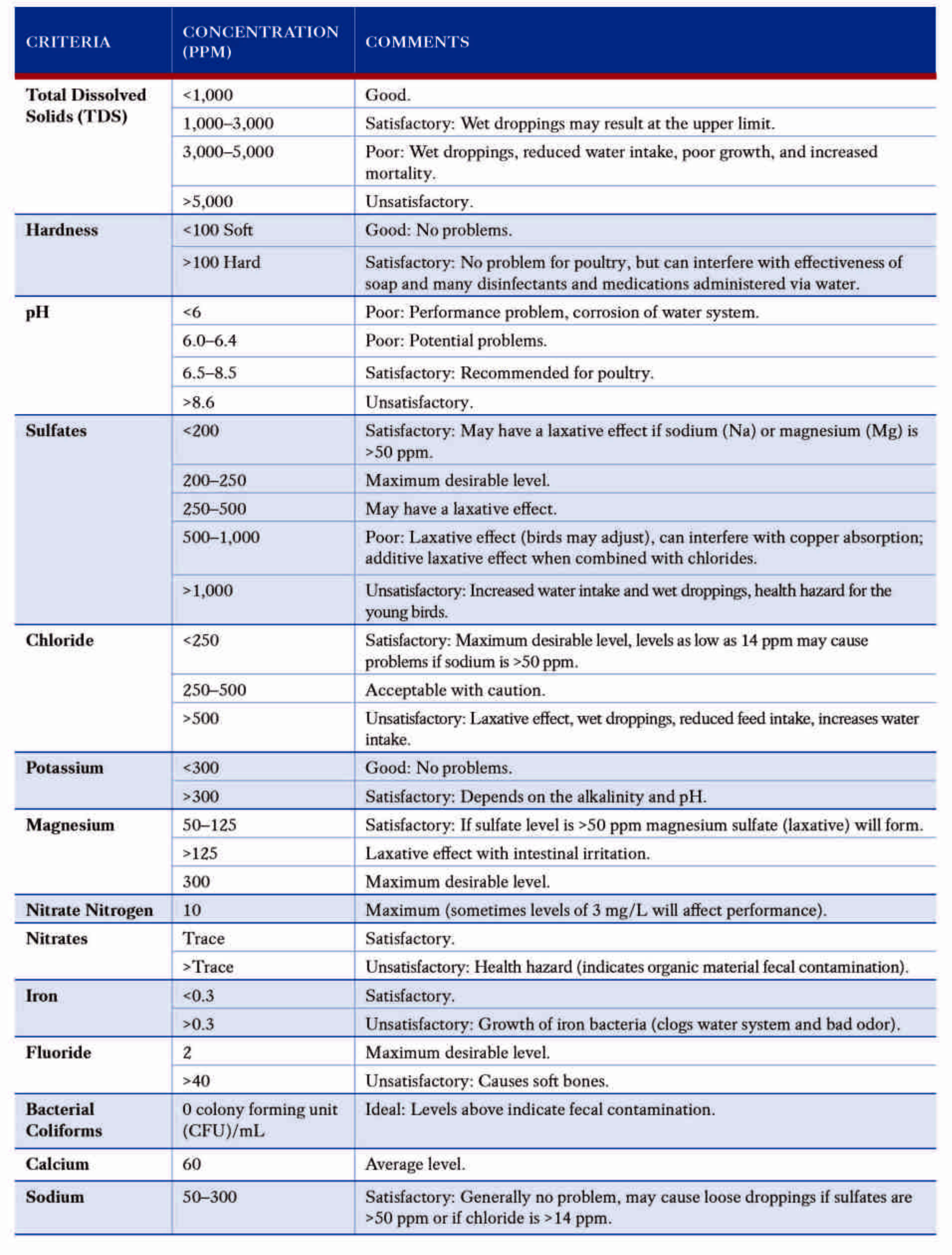 A supply of clean, uncontaminated water should be freely available to the birds at all times. However, depending on the source, the water supplied to the birds may contain excessive amounts of various minerals or be contaminated with bacteria. Acceptable levels of minerals and organic matter in the water supply are given in Table 1.