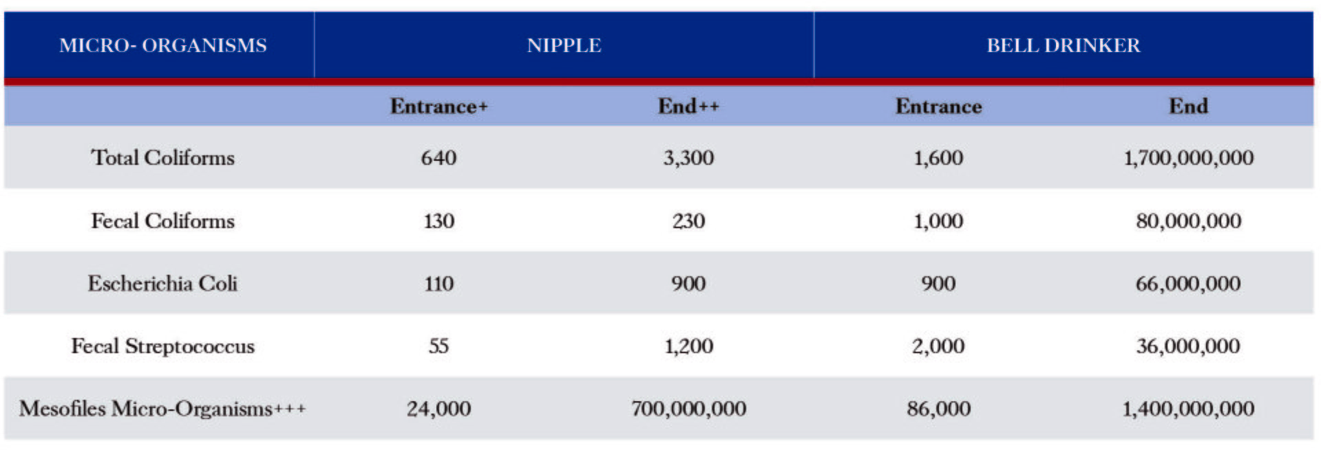 If proper maintenance of the water line does not occur, microbial contamination can build up, affecting bird performance, reducing the effectiveness of medication and vaccination, and reducing nipple flow rate. Implementing a regular water sanitation and line cleaning program will prevent the build-up of microbial contamination. Controlling bacterial load is much more difficult with open drinker systems as they are exposed to contamination by fecal dust and the oral and nasal secretions of birds as they drink (Table 2).